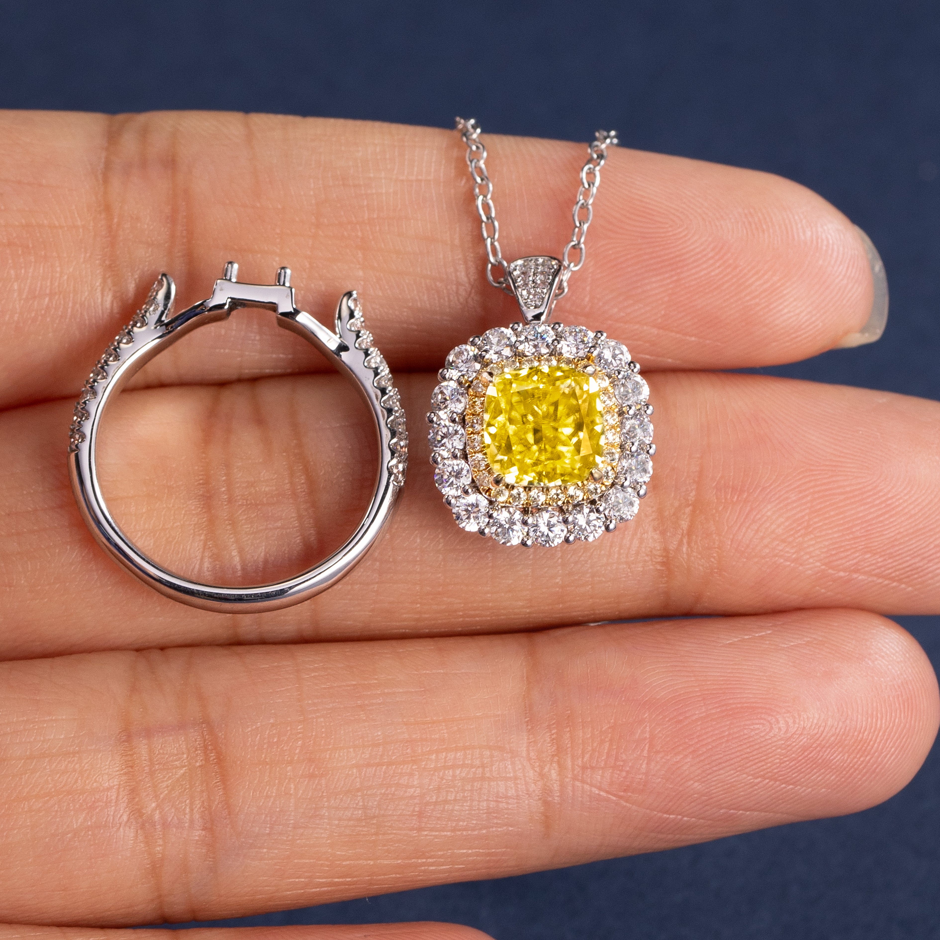 - Both our natural and lab-grown diamonds are meticulously selected, featuring Fancy Intense or Fancy Vivid color and VVS clarity. Even the side stones are carefully chosen with F–G color and VS clarity natural diamonds, ensuring that every finished piece is of exceptional quality and brilliance. Each product comes with a certificate from a professional gemological laboratory, adding further value and trust to every piece.